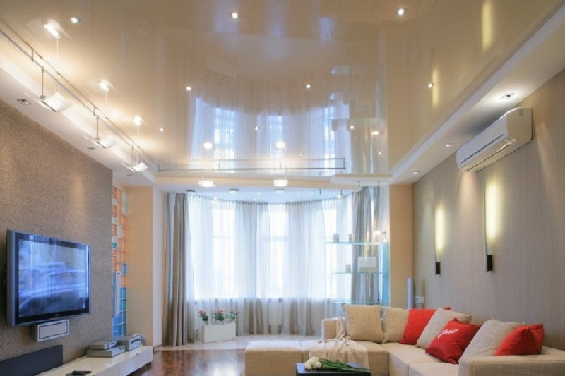 Чем больше помещение, тем больше потребуется для него материала и бюджет, соответственно вырастет. Есть разница и в типе. В частности, сертифицированная по ГОСТу ткань обойдется в 3-4 раза дороже пленки ПВХ такого же хорошего качества. Цена последней также разнится: белое полотно любого европейского производителя заметно дешевле цветного, особенно ярких тонов, поэтому учитывайте этот момент.