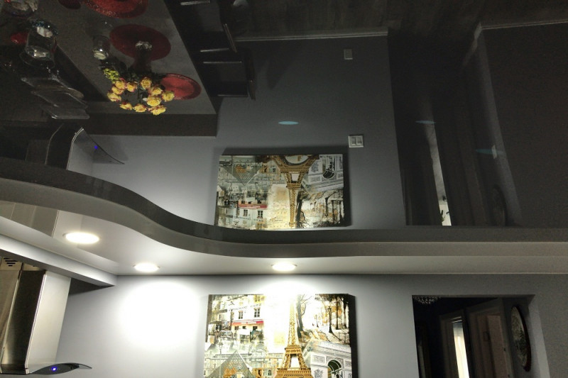 Есть разные варианты стилистических решений такой конструкции. Чаще всего уровни представляют собой комбинации разных фактур пленочных полотен. Например, чтобы подчеркнуть объем или зонировать помещение, выбирают контрастные цвета: черный, белый, красный и т.п. Если при этом есть разница еще и в фактурах (глянцевая и матовая), эффект гарантирован.