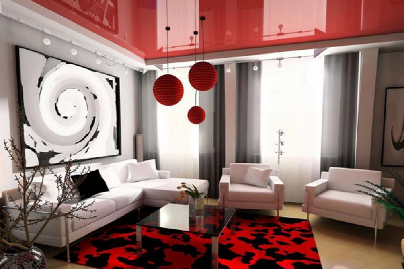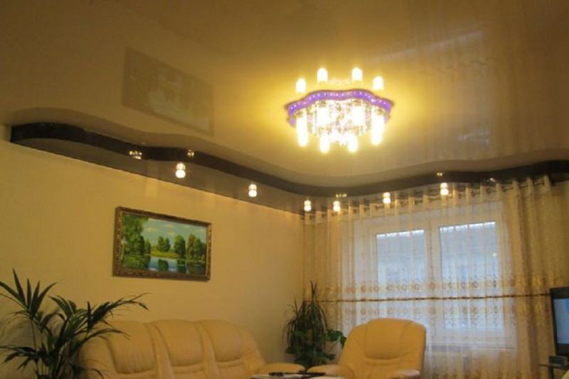 Есть разные варианты стилистических решений такой конструкции. Чаще всего уровни представляют собой комбинации разных фактур пленочных полотен. Например, чтобы подчеркнуть объем или зонировать помещение, выбирают контрастные цвета: черный, белый, красный и т.п. Если при этом есть разница еще и в фактурах (глянцевая и матовая), эффект гарантирован.
