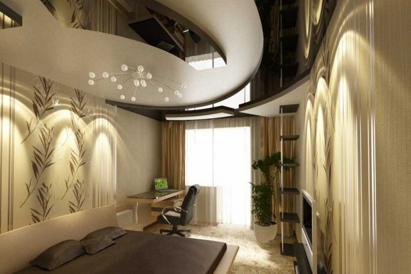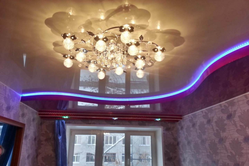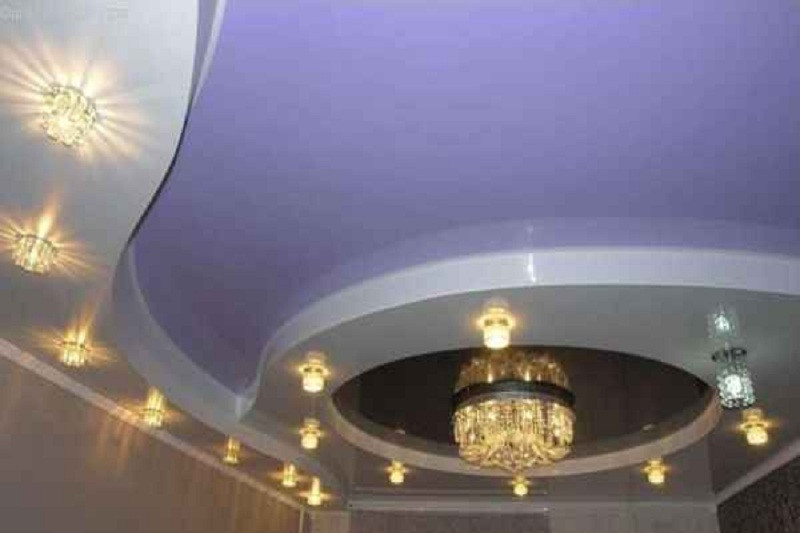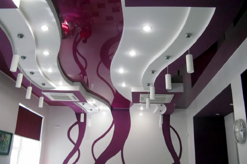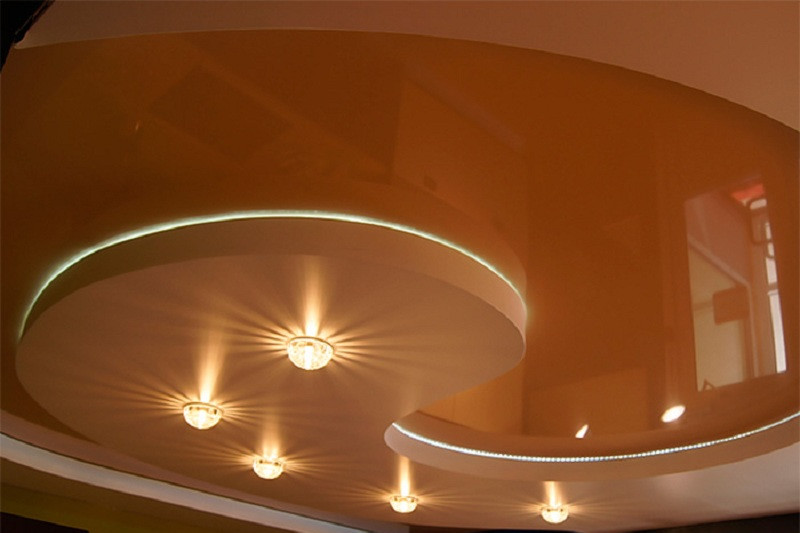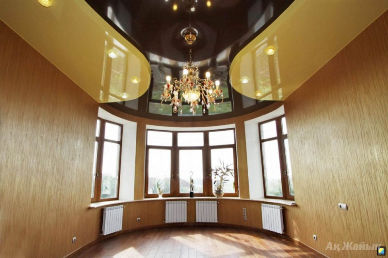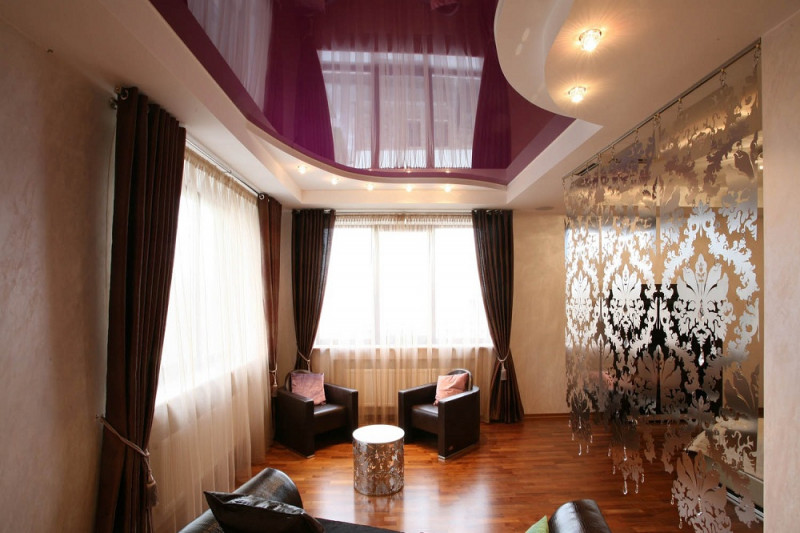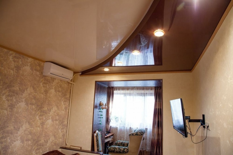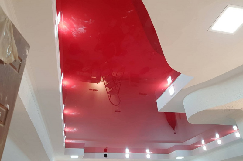 Есть разные варианты стилистических решений такой конструкции. Чаще всего уровни представляют собой комбинации разных фактур пленочных полотен. Например, чтобы подчеркнуть объем или зонировать помещение, выбирают контрастные цвета: черный, белый, красный и т.п. Если при этом есть разница еще и в фактурах (глянцевая и матовая), эффект гарантирован.