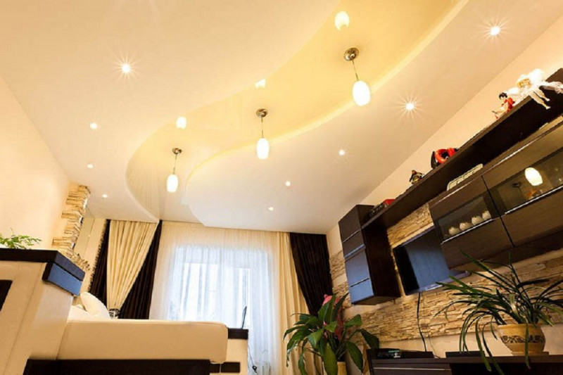 Из тканевых полотен также делаются многоуровневые покрытия, но здесь сочетания обычно не такие яркие. Выбирается белый цвет, в котором решается весь потолок. Благодаря этому контраст получается более мягким и создается не за счет цвета или блеска, а за счет сочетания горизонтальных поверхностей. Таким способом также можно зонировать пространство и сейчас его выбирают чаще, так как им хорошо дополнять минималистичный дизайн, популярный в последнее время.