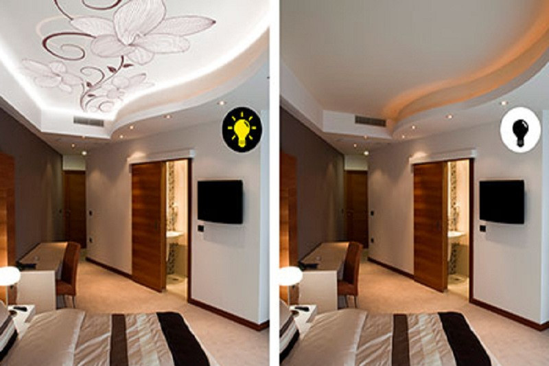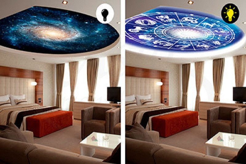 В комнате с повышенной влажностью (ванной, душевой, туалете), идеальной будет пленка ПВХ, так как она точно не восприимчива к сырому воздуху, а вот для спальни, детской или гостиной подойдет ткань. У нее не так много разных цветов, но несмотря на минимальную палитру возможен необычный дизайн с декоративными элементами, в том числе со встроенным светом или декоративное звездное небо.