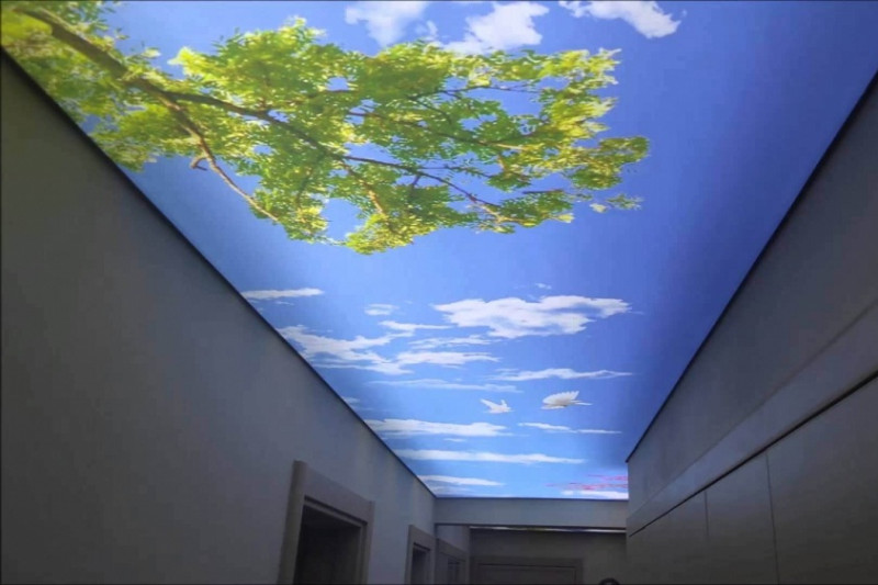 Рисунок может быть любым. Для кухни или ванной выбирают что-то тематическое: фрукты, подводный мир и т.п. Для гостиной, спальни, детской подходят пейзажи, кроны деревьев, небо в облаках или изображения любимых ребенком сказочных героев.