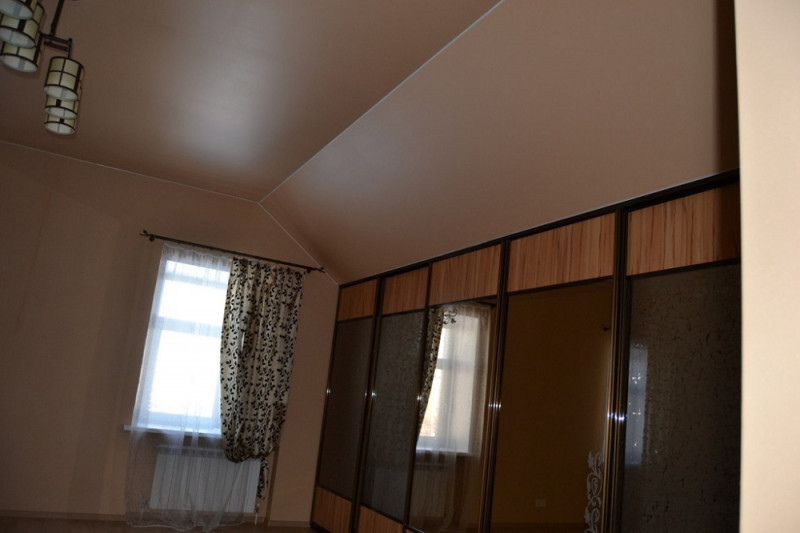 Тем, кто предпочитает более характерные решения, рекомендуем установить яркое матовое полотно. Оно смотрится особенно эффектно, так как кажется идеально ровной крашеной поверхностью.