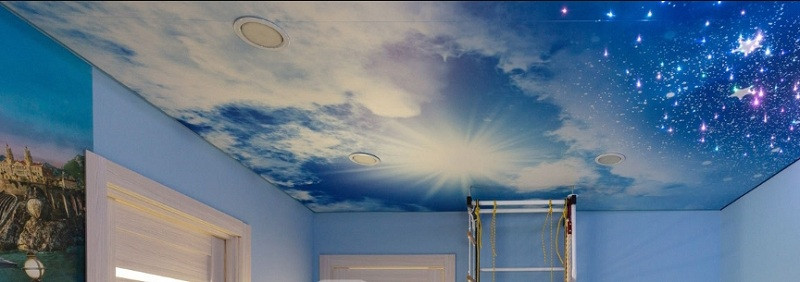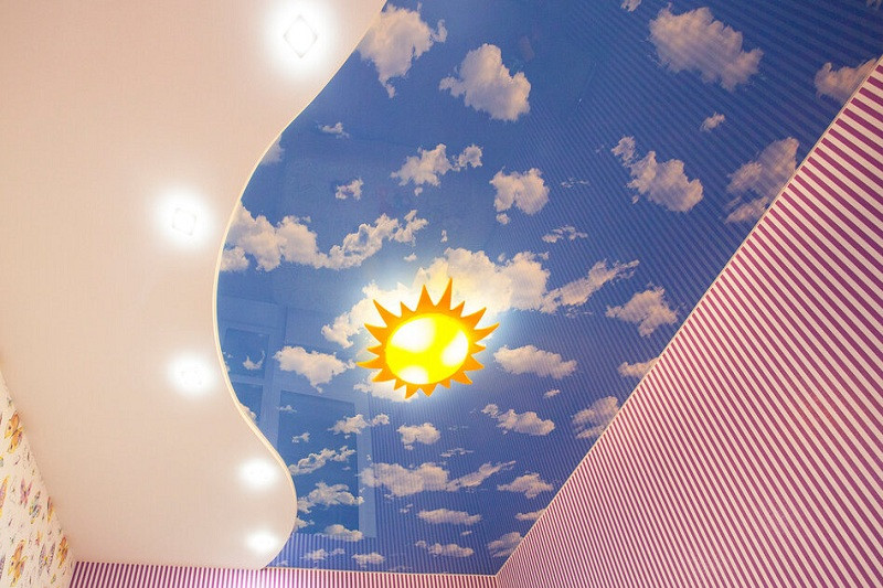 В комнате с повышенной влажностью (ванной, душевой, туалете), идеальной будет пленка ПВХ, так как она точно не восприимчива к сырому воздуху, а вот для спальни, детской или гостиной подойдет ткань. У нее не так много разных цветов, но несмотря на минимальную палитру возможен необычный дизайн с декоративными элементами, в том числе со встроенным светом или декоративное звездное небо.