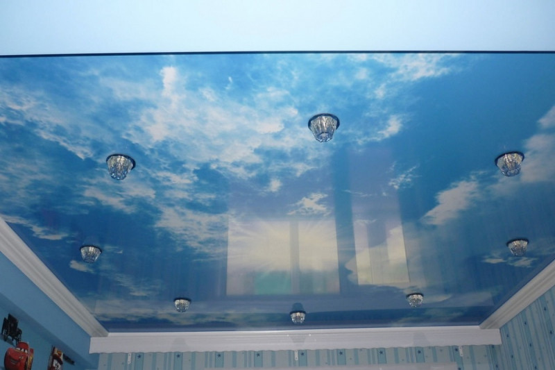 Рисунок может быть любым. Для кухни или ванной выбирают что-то тематическое: фрукты, подводный мир и т.п. Для гостиной, спальни, детской подходят пейзажи, кроны деревьев, небо в облаках или изображения любимых ребенком сказочных героев.