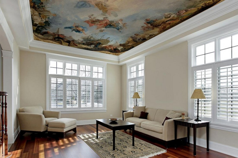 Рисунок может быть любым. Для кухни или ванной выбирают что-то тематическое: фрукты, подводный мир и т.п. Для гостиной, спальни, детской подходят пейзажи, кроны деревьев, небо в облаках или изображения любимых ребенком сказочных героев.