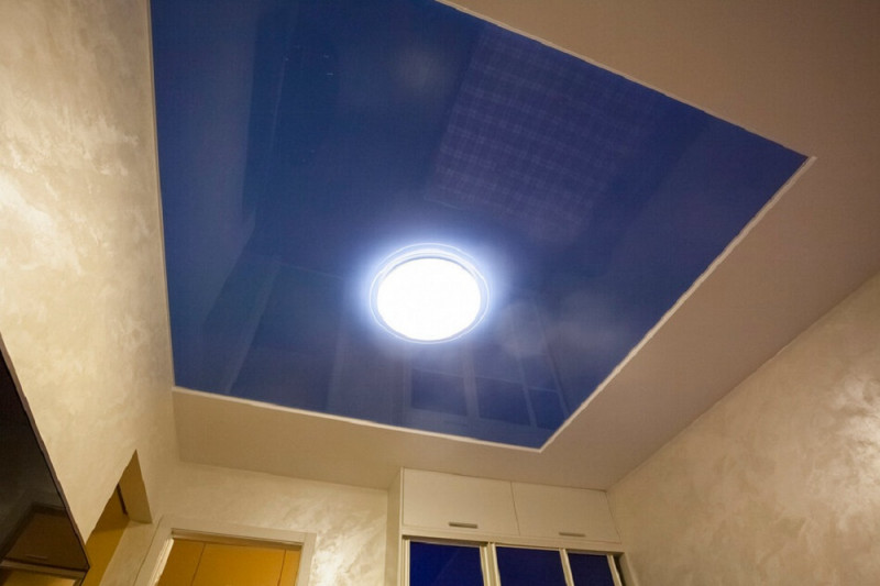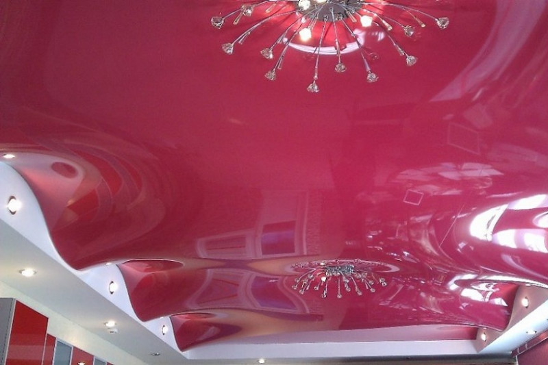 Тем, кто предпочитает более характерные решения, рекомендуем установить яркое матовое полотно. Оно смотрится особенно эффектно, так как кажется идеально ровной крашеной поверхностью.