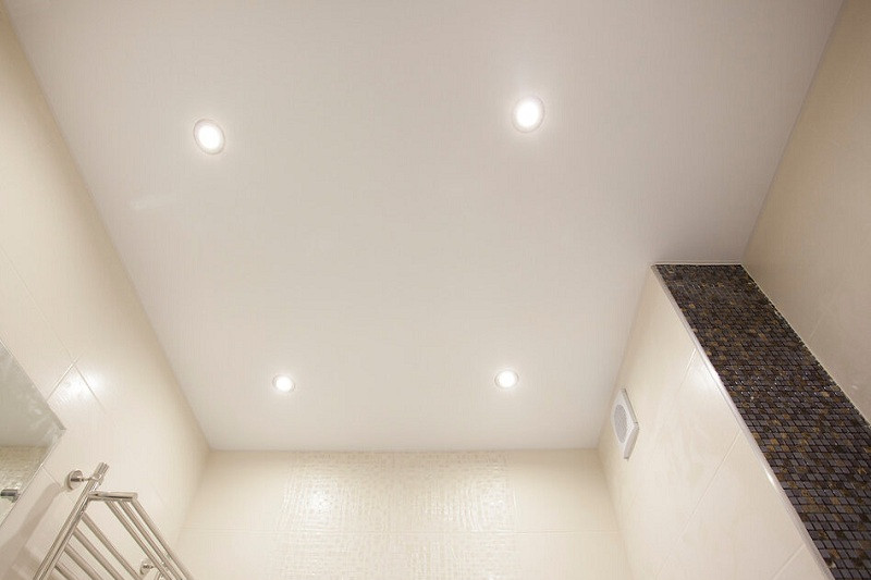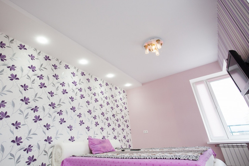 В комнате с повышенной влажностью (ванной, душевой, туалете), идеальной будет пленка ПВХ, так как она точно не восприимчива к сырому воздуху, а вот для спальни, детской или гостиной подойдет ткань. У нее не так много разных цветов, но несмотря на минимальную палитру возможен необычный дизайн с декоративными элементами, в том числе со встроенным светом или декоративное звездное небо.