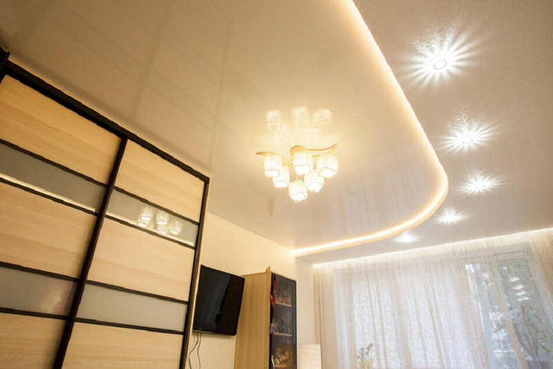 Для усиления эффекта объема попросите на стадии замера во Владимире мастера рассчитать несколько источников света. Они не обязательно должны быть мощными, подойдут споты, светодиодные светильники, но чем их больше, тем больше отражений появится на потолке.