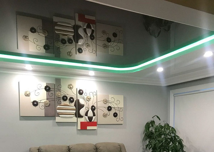Есть разные варианты стилистических решений такой конструкции. Чаще всего уровни представляют собой комбинации разных фактур пленочных полотен. Например, чтобы подчеркнуть объем или зонировать помещение, выбирают контрастные цвета: черный, белый, красный и т.п. Если при этом есть разница еще и в фактурах (глянцевая и матовая), эффект гарантирован.
