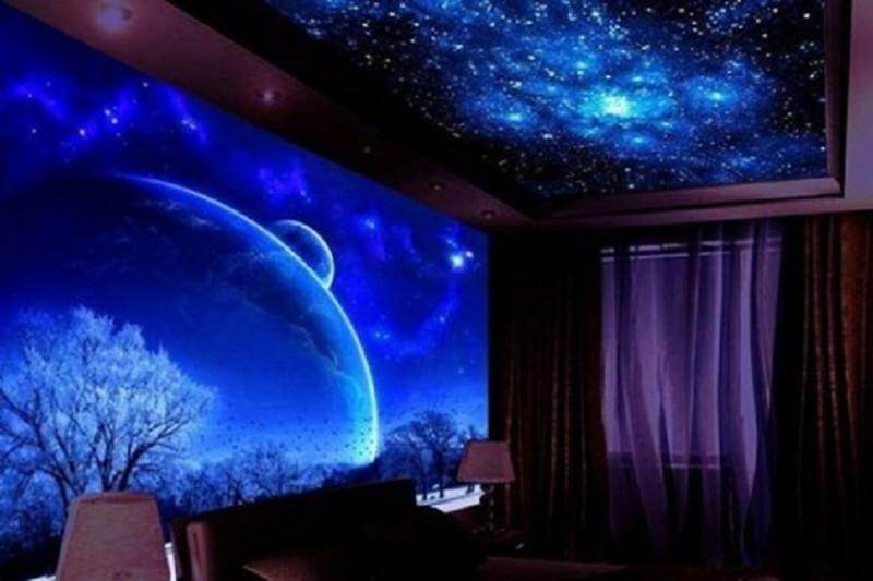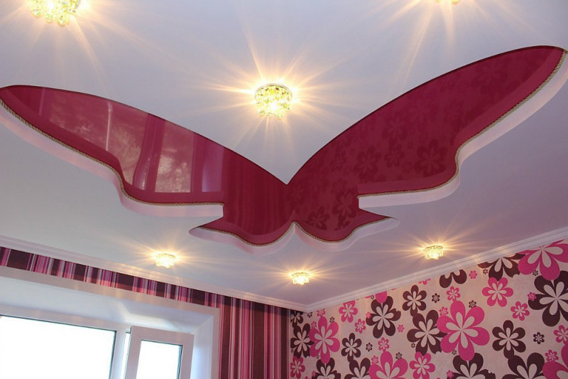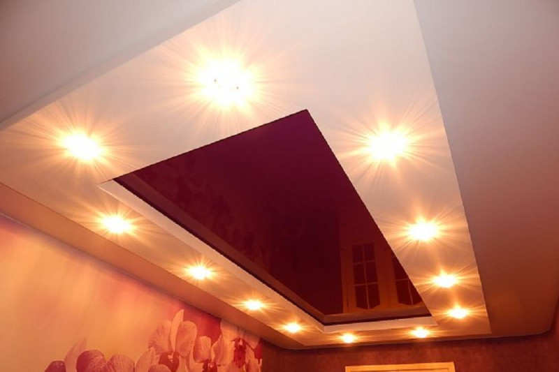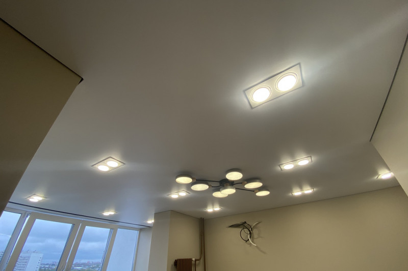 Минимальное расстояние, на которое опускается натяжное полотно – это 3-4 см, такова ширина профиля. Если стены неровные или требуется маскировка коммуникаций, расстояние увеличится.
