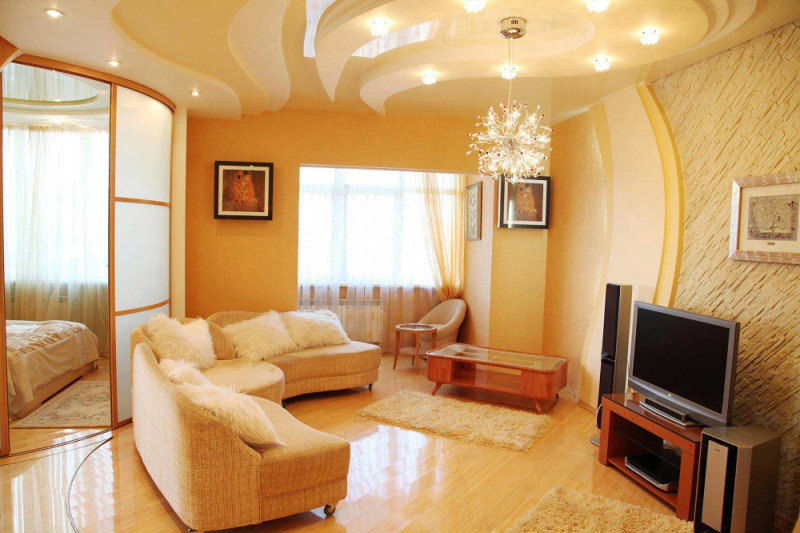Потолок в несколько уровней занимает не так много высоты стен (7-10 см), зато позволяет скрыть неудачные конструктивные особенности помещения, коммуникации, зонировать его.