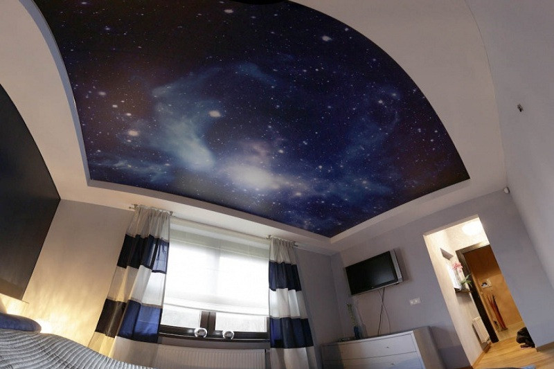 В комнате с повышенной влажностью (ванной, душевой, туалете), идеальной будет пленка ПВХ, так как она точно не восприимчива к сырому воздуху, а вот для спальни, детской или гостиной подойдет ткань. У нее не так много разных цветов, но несмотря на минимальную палитру возможен необычный дизайн с декоративными элементами, в том числе со встроенным светом или декоративное звездное небо.