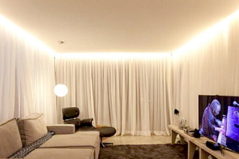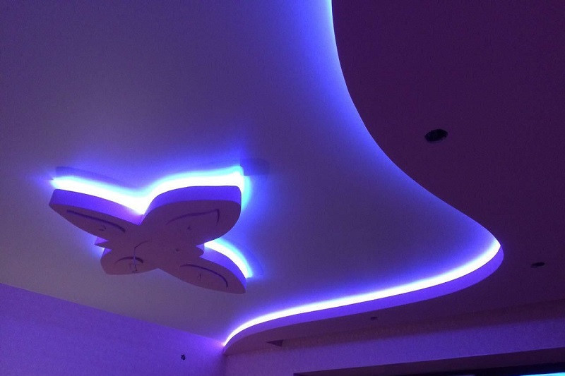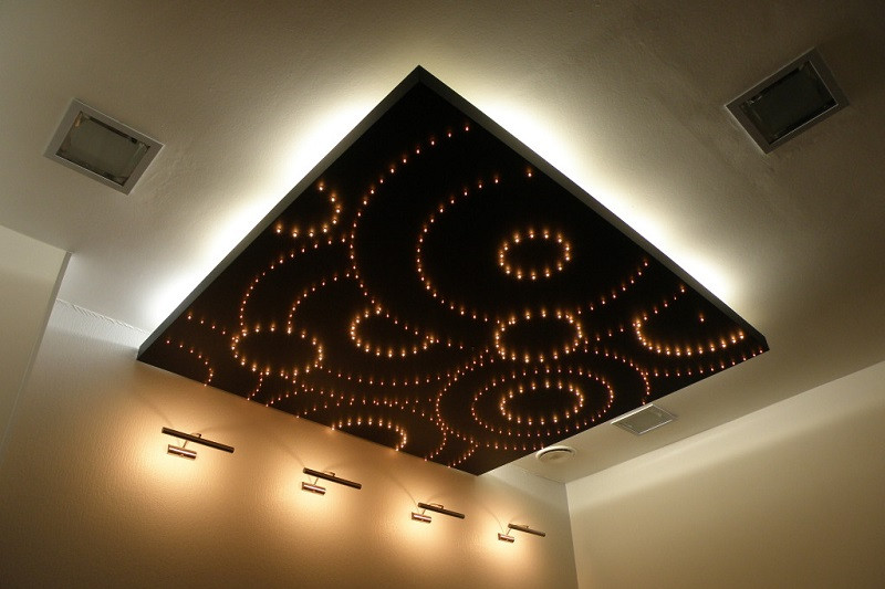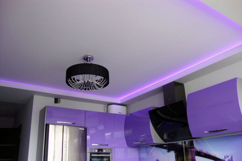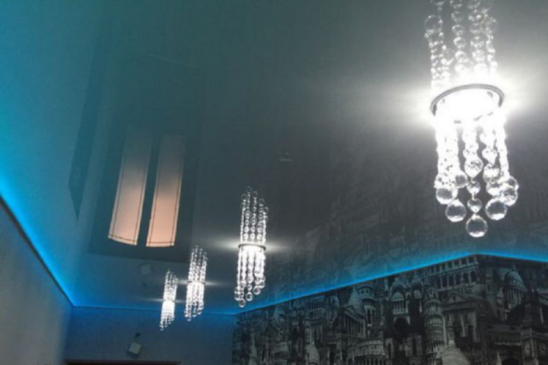 Чтобы не повредить светодиоды, сразу отключите электричество в комнате. После устранения течи наш сотрудник сольет воду, высушит потолок, проверит сохранность проводки, вернет полотно на место.