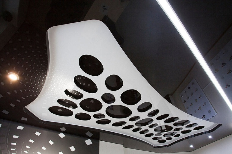 Есть разные варианты стилистических решений такой конструкции. Чаще всего уровни представляют собой комбинации разных фактур пленочных полотен. Например, чтобы подчеркнуть объем или зонировать помещение, выбирают контрастные цвета: черный, белый, красный и т.п. Если при этом есть разница еще и в фактурах (глянцевая и матовая), эффект гарантирован.