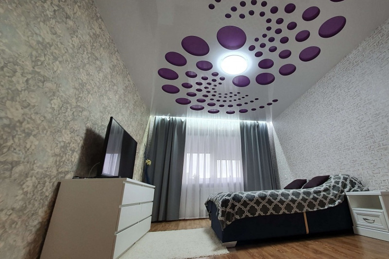 Тем, кто предпочитает более характерные решения, рекомендуем установить яркое матовое полотно. Оно смотрится особенно эффектно, так как кажется идеально ровной крашеной поверхностью.