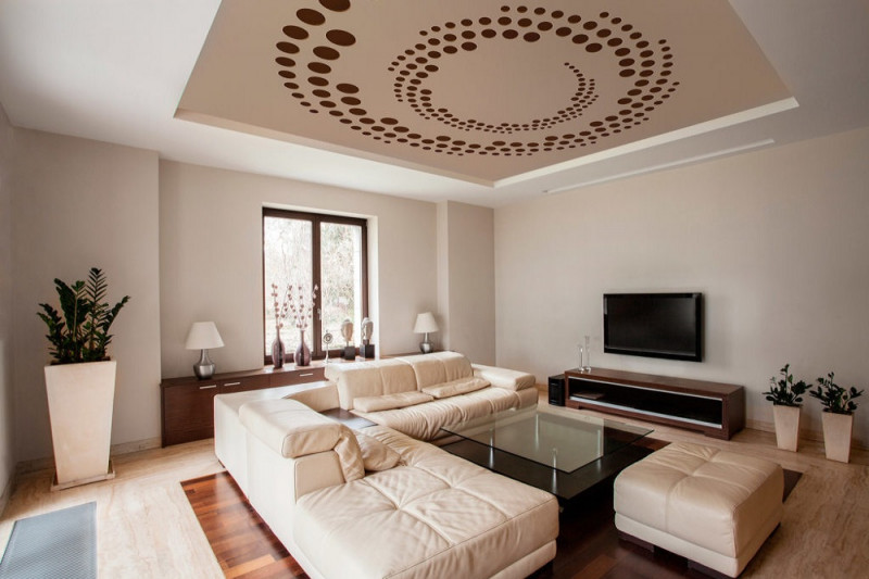 Такой потолок смотрится внушительно, привычно, он сочетается с любым стилем дизайна, не привлекает к себе лишнее внимание. Это особенно актуально для комнат с лаконичной отделкой в серых, бежевых цветах, которые особенно модны сейчас.