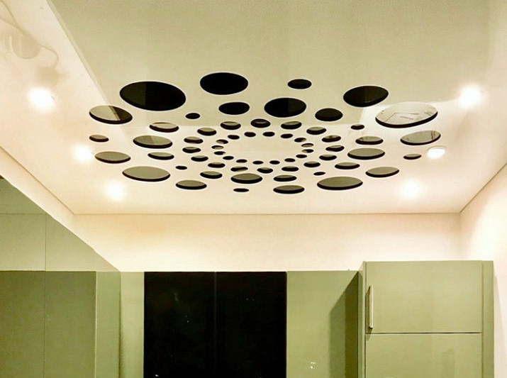 В комнате с повышенной влажностью (ванной, душевой, туалете), идеальной будет пленка ПВХ, так как она точно не восприимчива к сырому воздуху, а вот для спальни, детской или гостиной подойдет ткань. У нее не так много разных цветов, но несмотря на минимальную палитру возможен необычный дизайн с декоративными элементами, в том числе со встроенным светом или декоративное звездное небо.