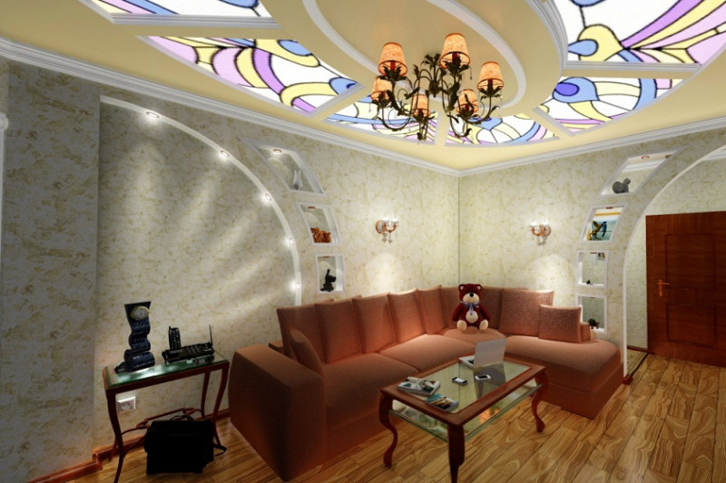 Потолок в несколько уровней занимает не так много высоты стен (7-10 см), зато позволяет скрыть неудачные конструктивные особенности помещения, коммуникации, зонировать его.